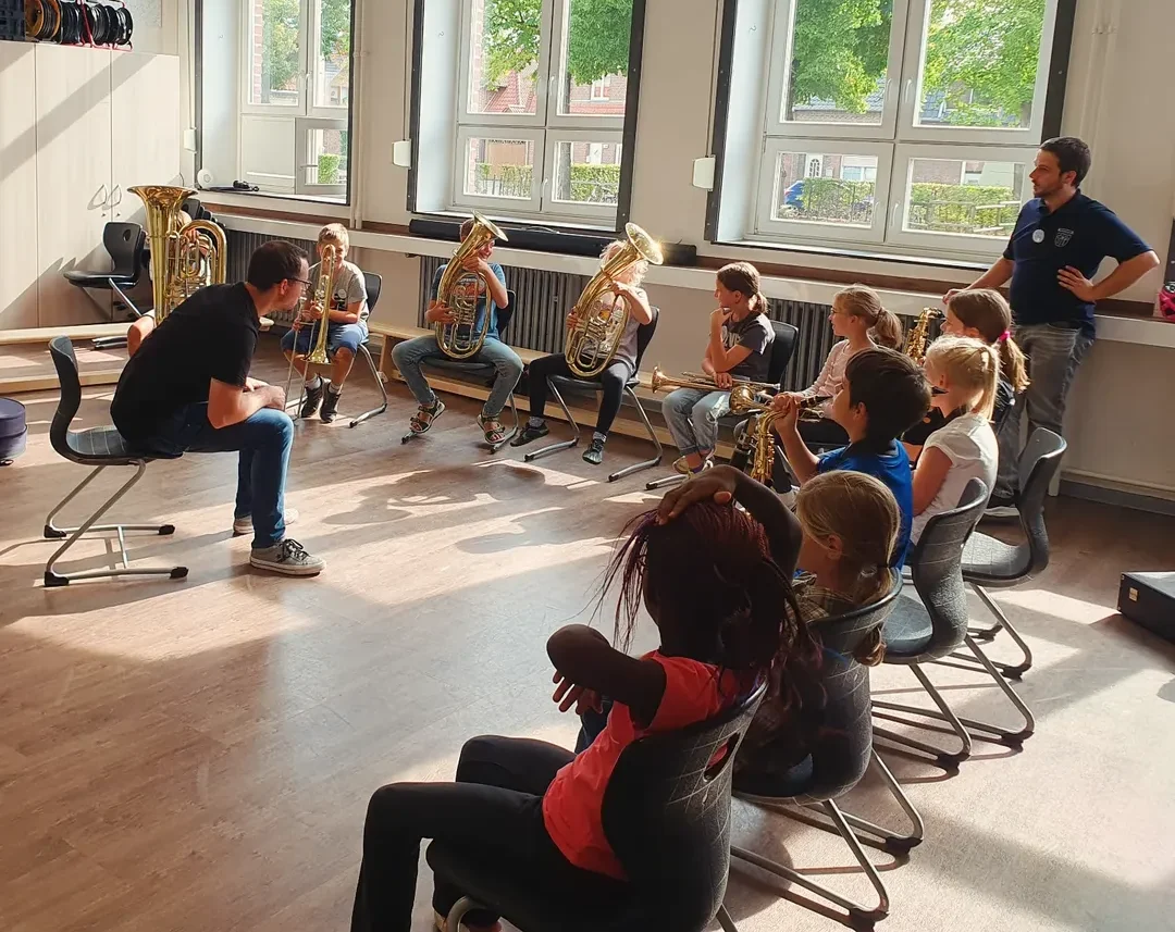Später werden die Instrumente unter den Schülerinnen und Schülern aufgeteilt, sodass ein spielfähiges Orchester entsteht. Ab erhalten die Kinder, neben dem gemeinsamen Musizieren in der Bläserklasse, zusätzlich Einzelunterricht.